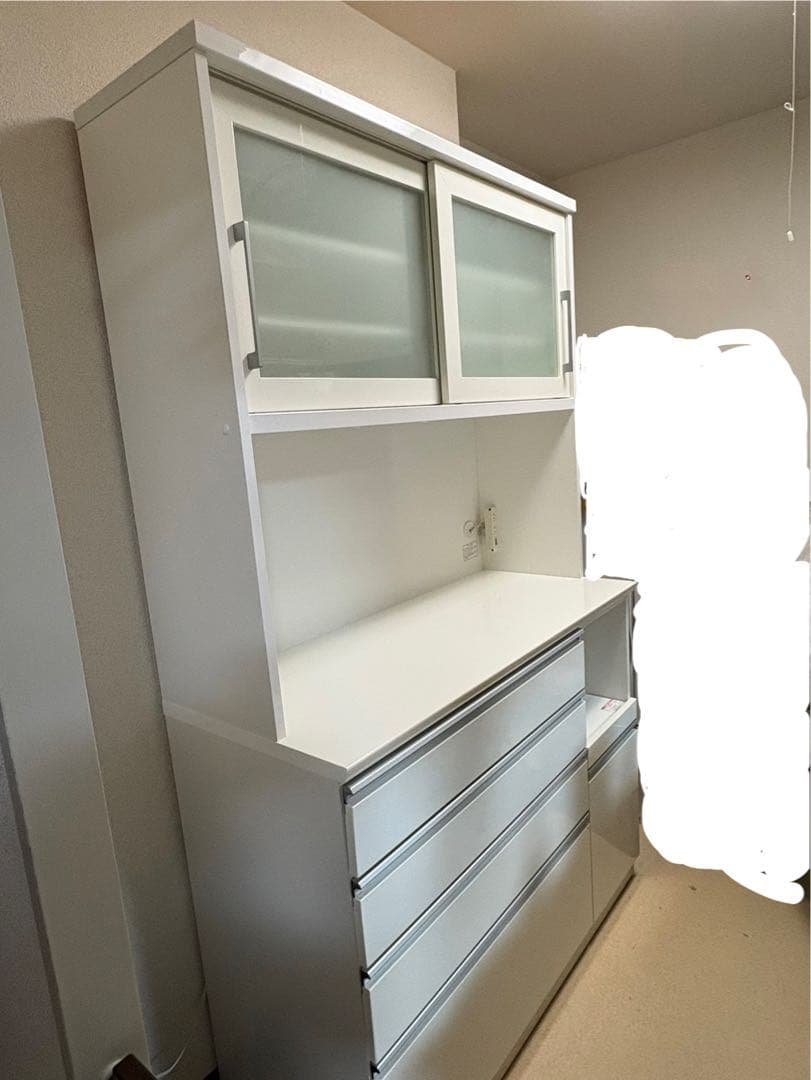 綾野製作所 の食器棚 です。2口のコンセントが2箇所、合計4口、備わっております。写真右側の棚は、蒸気が出るものが置ける素材になっており、炊飯器やポットを置く事が可能です。左右の棚は入れ替えられますが、開き戸の向きは恐らく変えられないため、使い勝手を考えると、写真のまま利用頂くのが良いと思います。サイズは次のとおりです。高さ 約200cm幅 約111cm (40.5 + 70.5)奥 約51.5cm (中段、丸みのある棚の最も出っ張った所まで)2012年6月に購入したものです。長期間使用したものですので、いくつか小さな傷や汚れがあります。気になる事があれば、気軽にコメントください。価格は、ほとんど送料と手数料のみとなっているため、お値下げは難しい旨、ご理解ください。以下、自動生成文です。木製とガラスの収納キャビネット、スライドドア付き。- Color: White and Dark Brown- Material: Wood and Glass- Storage Type: Shelves and Drawers- Features: Sliding Doors and Pull-out Drawers- Dimensions: Tall Cabinetご覧いただきありがとうございます。以下、キーワード綾野製作所アヤノayano食器棚キッチンカウンター炊飯器ポットケトル